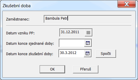| KonecZkusDoby | Datum konce zkušební doby. Položka O[332]. Bude-li nulová, automaticky se vypočítá. Jinak se zobrazí tak, jak byla vložena a přepočítá se po stisku tlačítka Spočti . Počítá se jako: VznikPP + DelkaZkusDobyM - 1 den Pokud bude zadáno KonecSjednDoby, provede se kontrola, zda zkušební doba není delší než polovina sjednané doby PP. Pokud je, vypočte zkušební dobu ve výši poloviny sjednané doby. |
