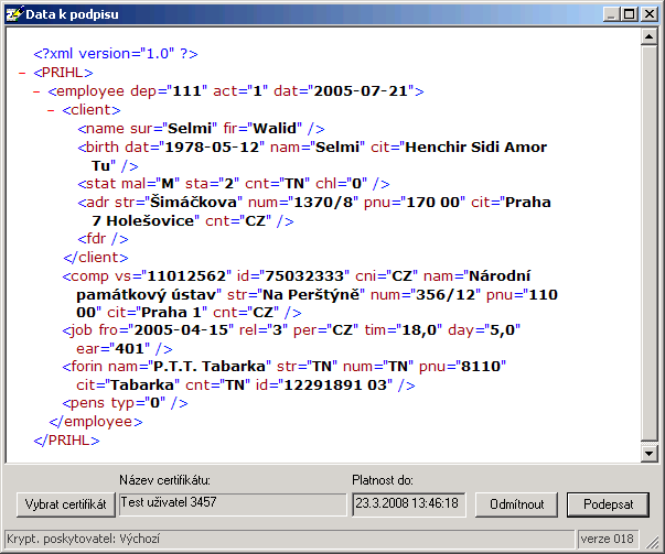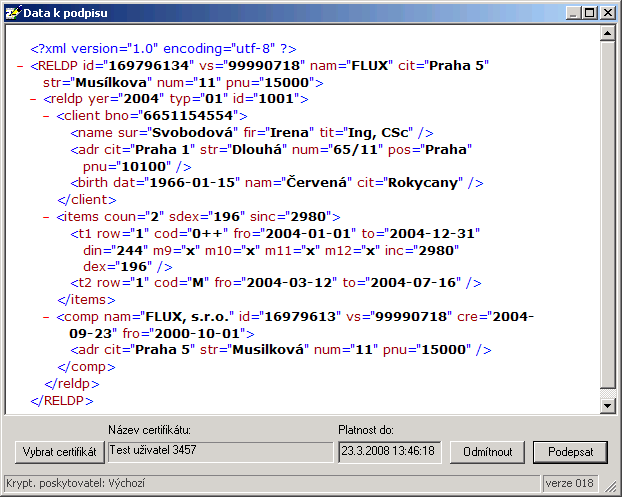 Jestliže se zdá, že XML struktura je v pořádku, stiskněte tlačítko [Podepsat]. V opačném případě stiskněte [Odmítnout]. Tlačítkem [Vybrat certifikát] si můžete dočasně vybrat certifikát, kterým chcete podání podepsat. Zde vybraný certifikát nebude ukládán pro další použití.