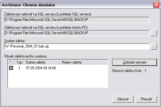 Provede kontrolu zadaných údajů a v případě, že je všechno v pořádku, rozbalí archivní soubor do zálohovacího adresáře SQL serveru a dá SQL serveru pokyn k dearchivaci dat. Toto tlačítko je přístupné pouze v případě, kdy je známo heslo uživatele 'sa' (viz předchozí bod).