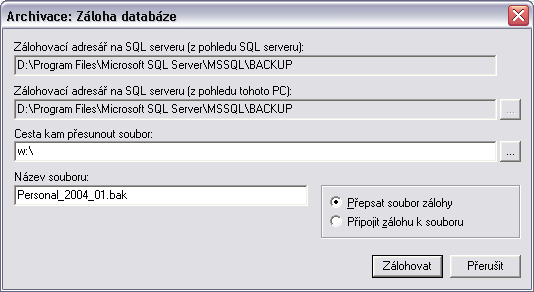 Tento adresář nelze měnit a je pouze informativní. Ukazuje, do kterého adresáře bude SQL server archivovat. Cesta zde uvedená je platná z pohledu počítače, na kterém SQL server běží. Jestliže provozujete SQL server na stejném počítači jako program Pam5, je to samozřejmě cesta z pohledu Vašeho počítače.
