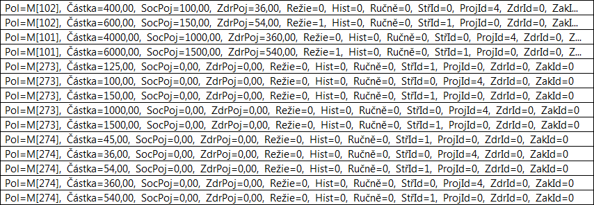 | ItemIdx | Index mzdové věty. Vrací všechny části rozdělení pouze pro tuto položku. Jestliže zadáte hodnotu nula, vrací se všechny položky s tím, že sociální a zdravotní pojištění bude rozděleno do jednotlivých položek s indexem položky PolIdxSP a PolIdxZP a pojištění bude vystupovat v částce!! Jestliže bude ItemIdx = PolIdxSP, budou vraceny položky sociálního pojištění nalezené u všech položek rozdělení a pojištění bude vystupovat v částce!! To samé platí pro ItemIdx = PolIdxZP. Viz příklad. |